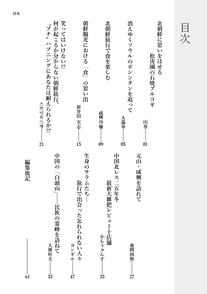 | 朝鮮趣味画報3 |  |  | 空前の豪華ゲストとページ数でお送りする第3号! (特別寄稿)朝鮮半島上空を乱舞する [紙爆弾(ビラ)][汚物風船]について 宮塚 利雄★ (特別寄稿)MV「親しみやすいお父様⦅オボイ⦆ 」 で感じた、思うこと 宮川 淳★ 朝鮮歌謡を作ってみよう! おん★ 進化する朝鮮カラオケ大会 / チンダルレゴッコ / ビデオコンテンツのデジタル化について 急行ポチョンボ★ 音楽団体・歌謡・歌手回顧録その2 Francis★ (特別寄稿)イラスト「平壌」 川島よしお★ (特別寄稿)共和国芸術家たちの衣装着回し疑惑とその考察 金浦基(キムポギ)★ (特別寄稿)ソルマジとソヘグムと私 オスカル★ 西暦とチュチェ年号の狭間で 「再入国許可書」のスタンプ うねこ★ 金正恩時代の朝鮮芸術映画 ―「新たなジャンル」の登場― 山葵★ (特別寄稿)ラジオでつながったリアルな北朝鮮 咸鏡冷麺★ (特別寄稿) 火山31についての考察 多田 将★ 読むだけで自衛的国防力が強化される学習漫画のコ~ナ~ ガ設★ 偽グッズから見える 北朝鮮ブランドの魅力・後編 ヨンギル★ 東京23区にある唯一の帰国事業記念碑を訪ねて George★ 砂浜チャレンジ! 東海・日本海でMADE IN DPRKを探す かんうぉんす★ 『パッチギ!』的京都さんぽ ~あのロケ地は今~ A温泉★ 大阪・猪飼野フィールドワーク ──高容姫・親しいオモニを訪ねて DAVIDOFF★ (合同企画) 2024・サッカー日朝戦ルポ |