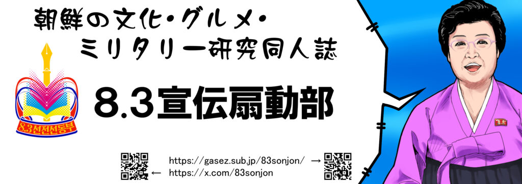 #北朝鮮 #同人誌 #コミケ #鉄道・旅行・メカミリ #同人活動 #朝鮮民主主義人民共和国 #薄い本 #コミケサークル,83宣伝扇動部,83宣伝扇動部,宣伝煽動部,文化,ミリタリー,旅行,音楽,グルメ,北朝鮮,朝鮮民主主義人民共和国,戦史,朝鮮音楽,カラオケ,朝鮮料理,中朝国境,金日成バッジ,コレクション,外国たばこ,中国旅行記,漫画,レストラン,観光,競馬,朝鮮学校,軍装,文具,北朝鮮ウォッチ,道端観察,グッズ研究,衣服,図解,朝鮮舞踊,金正恩,朝鮮カラオケ大会,朝鮮歌謡,朝鮮映画,軍事パレード,プロパガンダ,旅行記,朝鮮美術,COVID-19,キューピー,アンケート,マスゲーム,銃,服飾,民族衣装,モランボン楽団,制服,朝鮮革命歴史,チュチェ音楽,北朝鮮音楽,コスメ,ファッション,先軍女子,