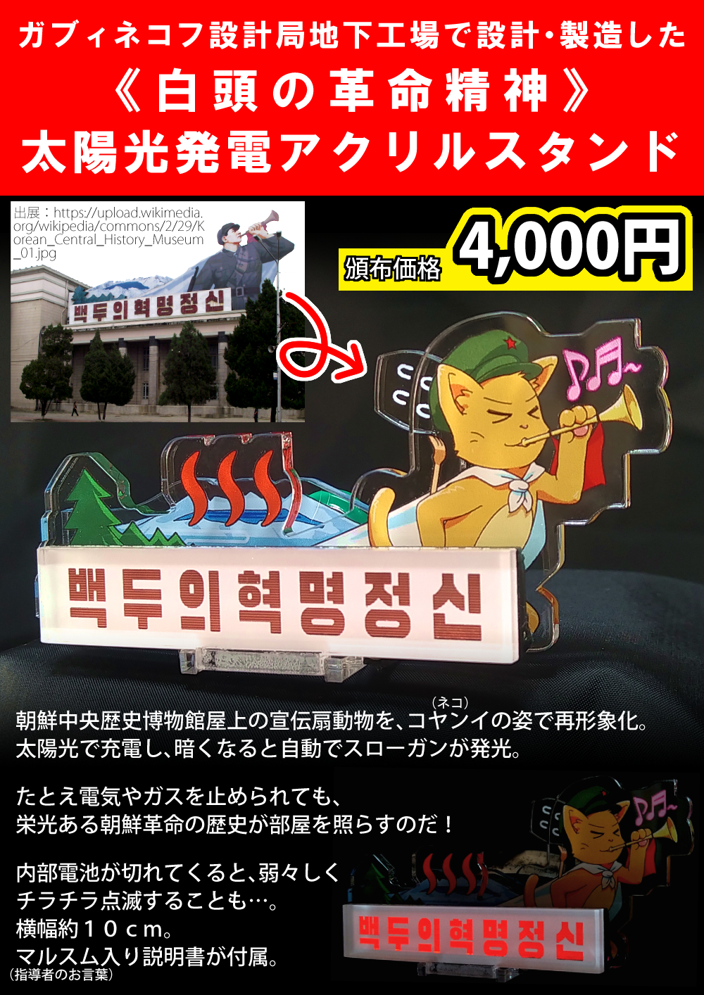 -北朝鮮(朝鮮民主主義人民共和国)の 金 日 成 広場にあった実在のモニュメントをオマージュしてアクリルスタンドを製作しました。暗くなると「白頭(ペクトゥ)の革命精神」という標語が1~3時間程度発光、その後は数時間ほど儚げにチラチラ点滅します。