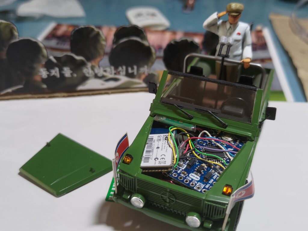 ベースキットはRevellの1/35軍用G型ベンツ”wolf”。細部パーツは3Dプリントで自作。arduino pro miniとRN42モジュールでラジコン化、電飾化。