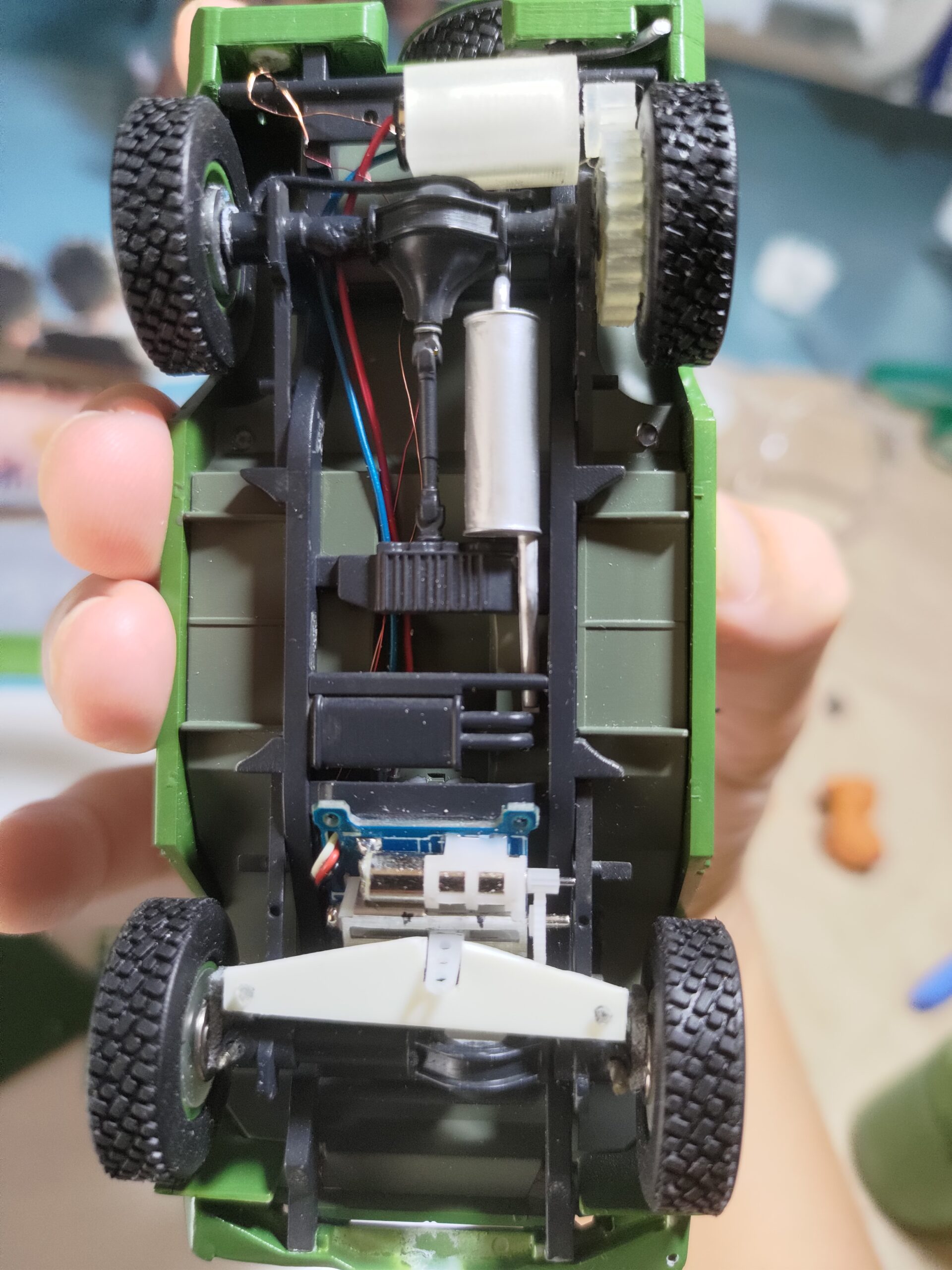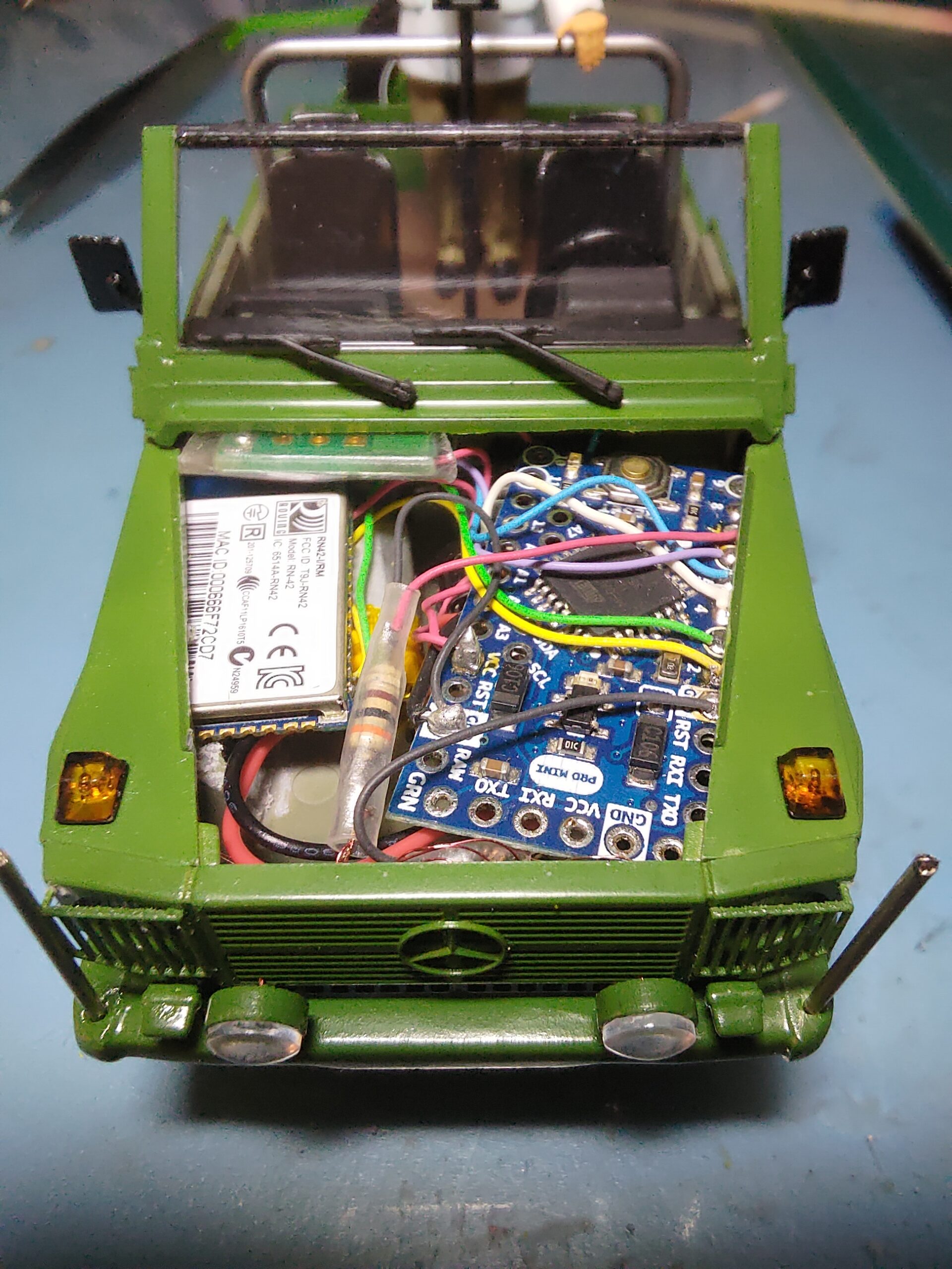 ベースキットはRevellの1/35軍用G型ベンツ”wolf”。細部パーツは3Dプリントで自作。arduino pro miniとRN42モジュールでラジコン化、電飾化。